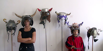 bestellte "Kuh-Masken", die aus alten Haushaltsgegenständen und Helmen gebaut wurden.